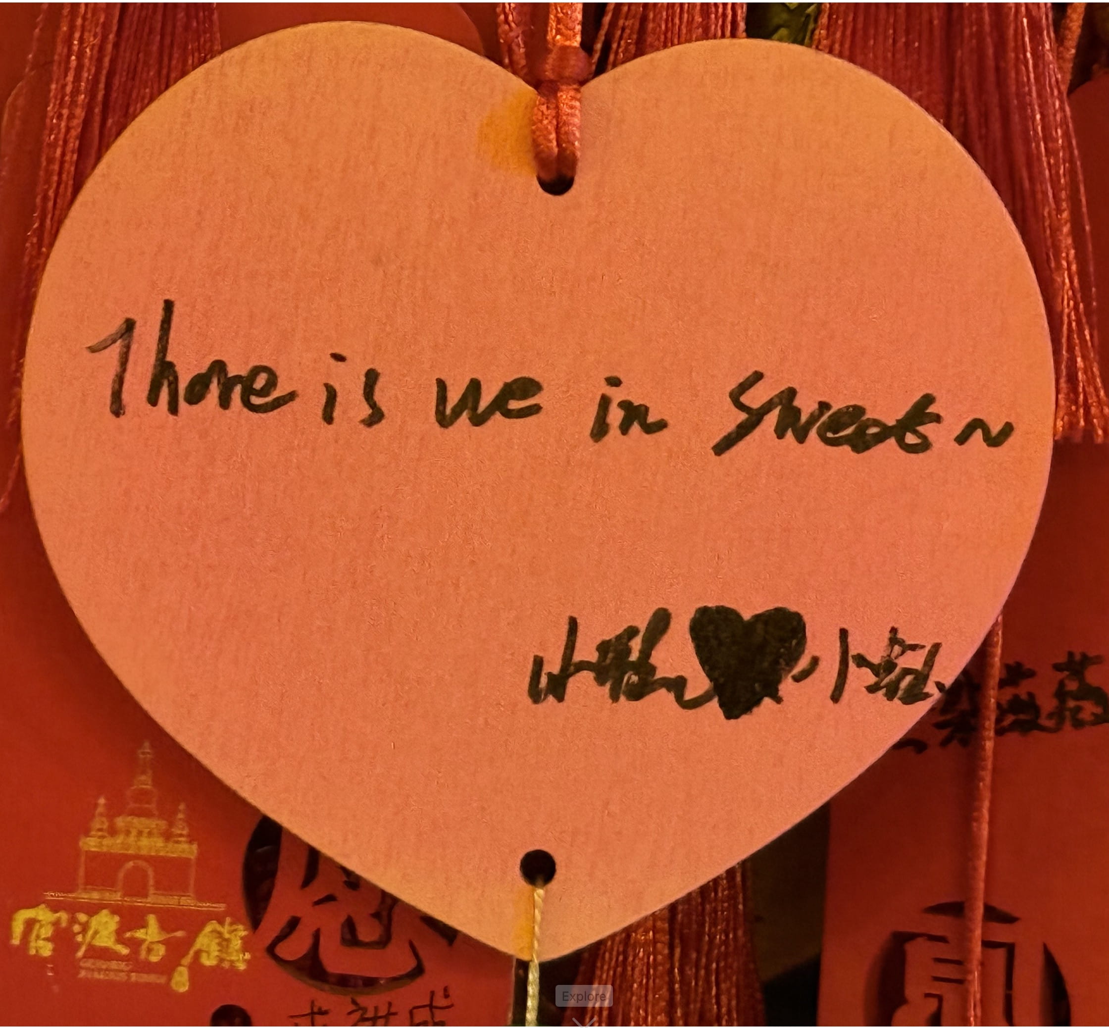 Among the vibrant red tassels and golden decorations of the ancient Yunnan temple, she held the soft pink heart-shaped blessing card in her hands. The words "There is our in journey" were written in careful English script, followed by Chinese characters that spoke of their shared path ahead. This wasn't just a tourist activity during their Yunnan adventure—it was a sacred moment where she put their hopes into words, trusting that the temple's ancient spirits would hear their whispered dreams.